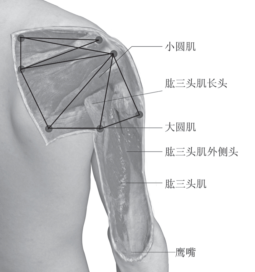 肩部筋膜立体三角区主要由浅深筋膜和肌肉构成。浅层三角区,主要由三角肌构成,其生物力学应力点为外侧方三角肌粗隆、前方小结节与肩峰端;深层三角区分为肩前和肩后,肩前三角区主要由肱二头肌、喙肱肌构成,肩后三角区主要由肱三头肌、大圆肌、小圆肌、冈上肌及冈下肌构成,其生物力学应力点为前方的喙突骨筋结点、外侧方大结节筋结点、后方的盂下结节筋结点。这些筋结点既是病理学损伤点,也是水针刀疗法的治疗点(图2-11)。