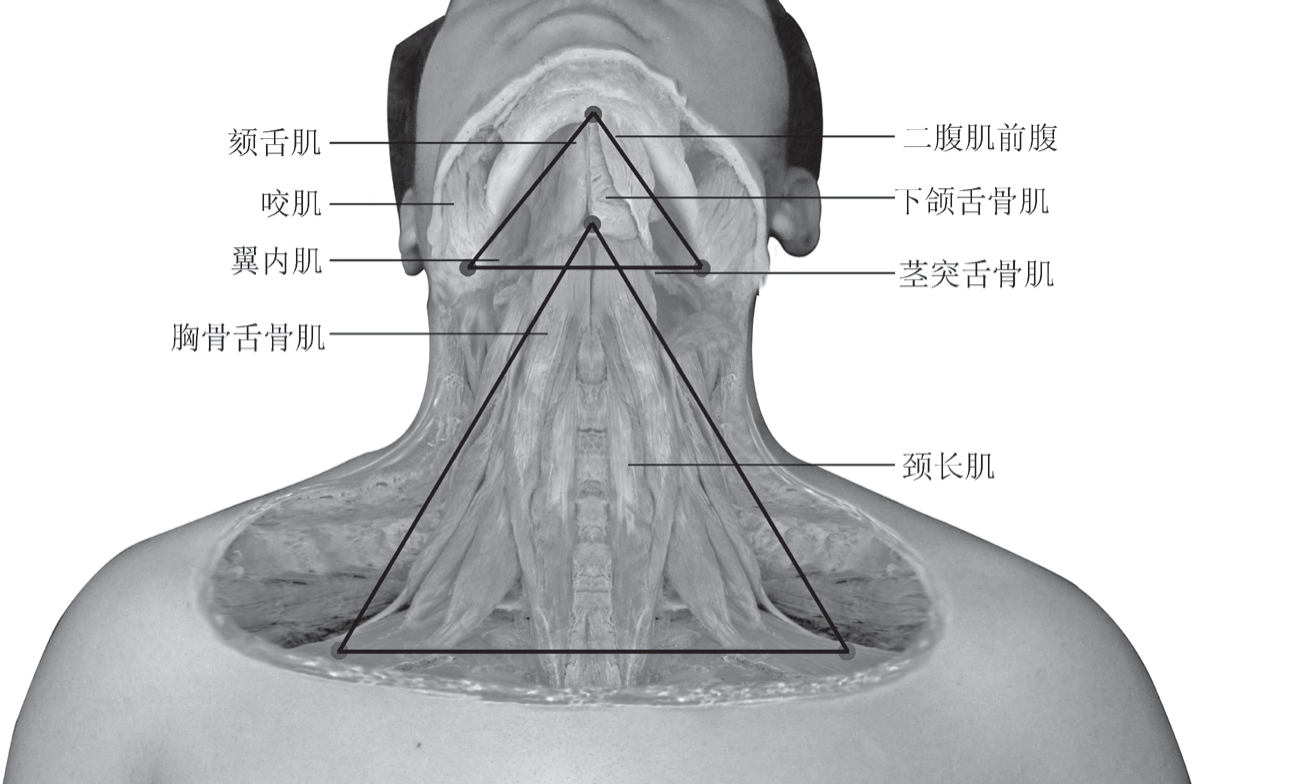 2.颈前部筋膜立体三角区 颈前筋膜立体三角区:主要由颈前部浅深筋膜及胸锁乳突肌构成。舌骨上三角区,主要由颏舌肌、二腹肌构成;舌骨下三角区,主要由胸骨舌骨肌、甲状舌骨肌构成;深层三角区,主要由颈前直肌、颈前侧肌构成。这些肌肉和筋膜构成的三角区维持着人体颈前部的动静态平衡,其生物力学应力点与病理学损伤点主要在喉结节筋结点与双侧胸锁关节筋结点,也是水针刀疗法的治疗点(图2-8,图2-9)。
