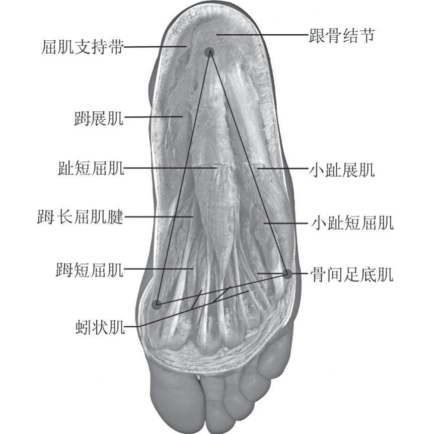 足底部筋膜立体三角区:主要由跖长韧带及跖筋膜构成。其主要生物力学应力点位于跟底筋结点、第1跖趾关节筋结点与第5跖趾关节筋结点。这些筋结点既是病理学损伤点,也是水针刀疗法的治疗点(图2-20)。