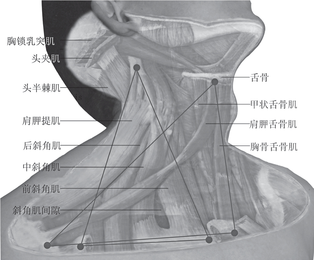 3.颈侧方筋膜立体三角区 浅层三角区主要由颈侧部浅深筋膜、斜方肌前缘、胸锁乳突肌后缘与肩胛舌骨肌构成,深层三角区主要由前斜角肌、中斜角肌、后斜角肌构成。这些肌肉和筋膜构成的三角区维持着人体颈部侧方的动静态平衡,其生物力学应力点与病理学损伤点主要在颞骨乳突筋结点、胸锁关节筋结点与肩峰端筋结点,也是水针刀疗法的治疗点(图2-10)。