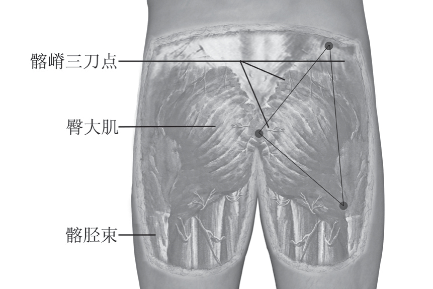 臀部筋膜立体三角区:主要由臀部浅深筋膜与臀大肌构成。其生物力学应力点主要在髂嵴上筋结点、髂后上棘筋结点与髂粗隆筋结点。这些筋结点既是病理学损伤点,也是水针刀疗法的治疗点(图2-16)。