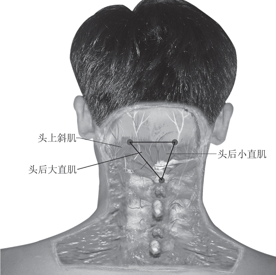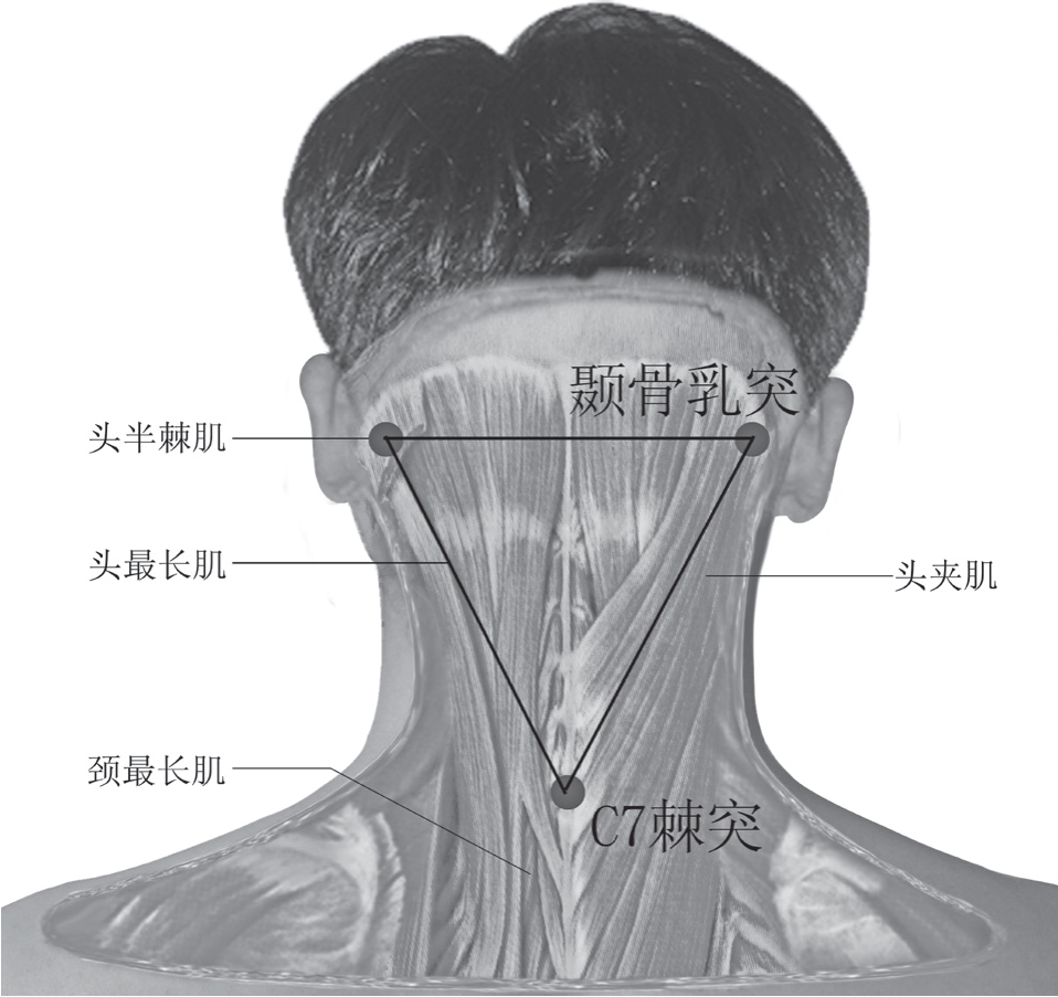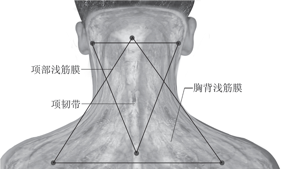 1.颈后部筋膜立体三角区 浅层三角区主要由项部浅深筋膜及斜方肌构成,其生物力学应力点在枕外隆凸筋结点与肩胛冈上中外筋结点;中层三角区主要由头夹肌构成,其生物力学应力点在双侧颞骨乳突筋结点与第7颈椎棘突筋结点;深层三角区主要由椎枕肌、头后大直肌、头上斜肌与头下斜肌构成,其生物力学应力点主要在第1颈椎横突筋结点、枕腱弓筋结点和第2颈椎棘突筋结点。这些肌肉和筋膜构成的三角区维持着人体颈后部的动静态平衡,其筋结点既是病理学损伤点,也是水针刀疗法的治疗点(图2-4至图2-7)。
