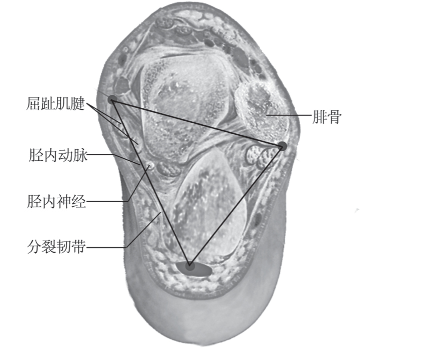 踝关节筋膜立体三角区:主要由浅深筋膜、跟后结节的跟腱、内踝前下方分裂韧带及外踝后下关节囊构成。其生物力学应力点主要在内踝前下筋结点、外踝后下筋结点、跟后筋结点。这些筋结点既是病理学损伤点,也是水针刀疗法的治疗点(图2-19)。