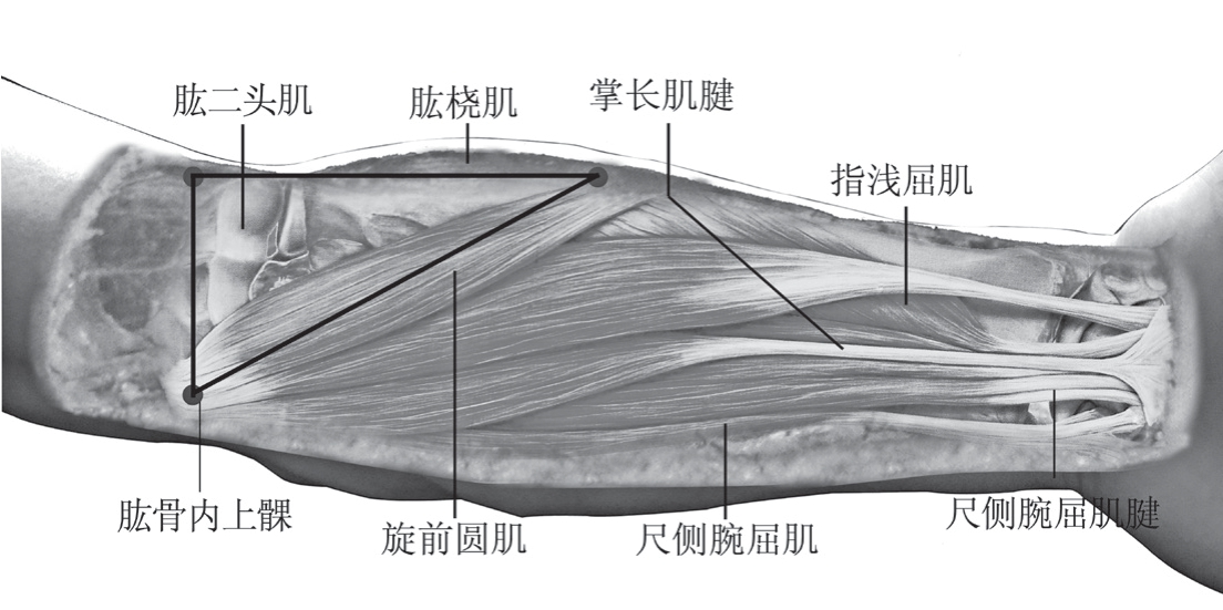 肘部肌筋膜立体三角区主要由浅深筋膜和肌肉构成,其生物力学应力点及病理损伤点主要在肱骨外上髁筋结点、肱骨内上髁筋结点和后方的尺骨鹰嘴筋结点。肱骨内上髁是前臂屈肌腱的起点,肱骨外上髁则是前臂伸肌腱的起点。这些筋结点既是病理学损伤点,也是水针刀疗法的治疗点(图2-12)。