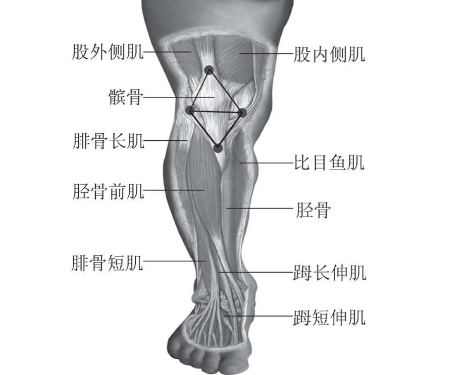 膝关节筋膜立体三角区:主要由浅深筋膜与股四头肌构成。其生物力学应力点主要在髌骨内外侧副韧带筋结点与髌韧带附着筋结点,即钟表定位法的3点、6点、9点。这些筋结点既是病理学损伤点,也是水针刀疗法的治疗点(图2-18)。