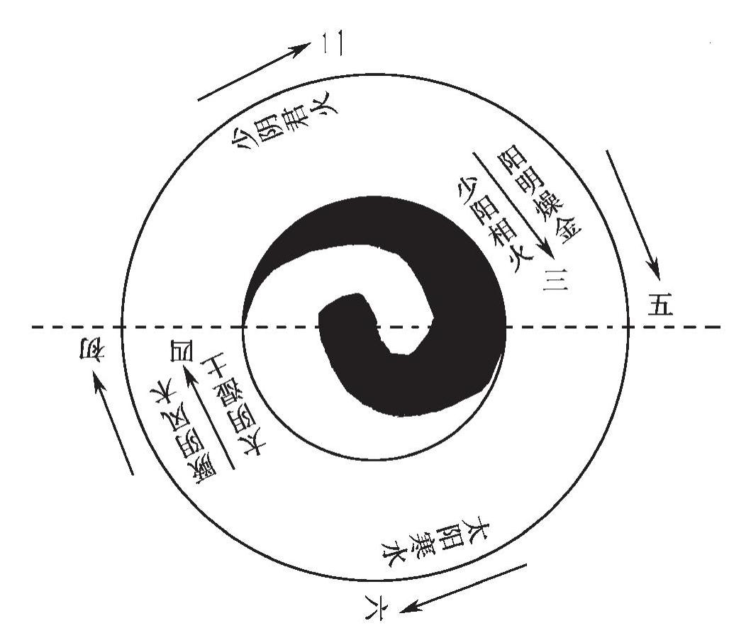 一年大气的圆运动,春木主生,夏火主长,秋金主收,冬水主藏,中土主化。生长收藏化,五行运动性能也。六气者,风热暑湿燥寒,五行运动不圆,偏见之气也。五行各一,唯火有二,故曰六气。二火者,君火运行,重在上升;相火运行,重在下降。相火由秋降入水中,再由春升上,乃为君火。而君火又随相火下降。名曰五行,其实六行。(参见图1)