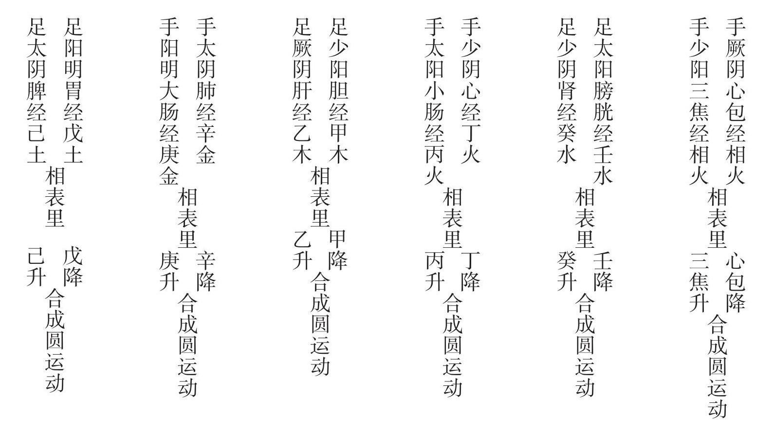 下图两经一气,一降一升。金主收敛,辛金收敛,自上而下,庚金收敛,自下而上,合成一圆运动。木主疏泄,乙木疏泄,自下而上,甲木疏泄,自上而下,合成一圆运动。他经仿此,反此者病。
