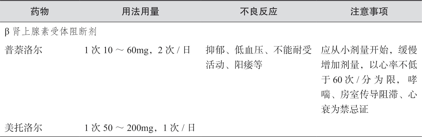 (3)可能导致永久性神经功能缺损的特殊变异型偏头痛,如偏瘫性偏头痛、基底型偏头痛或偏头痛性梗死等。偏头痛预防的常见药物如下(表3-3)。
