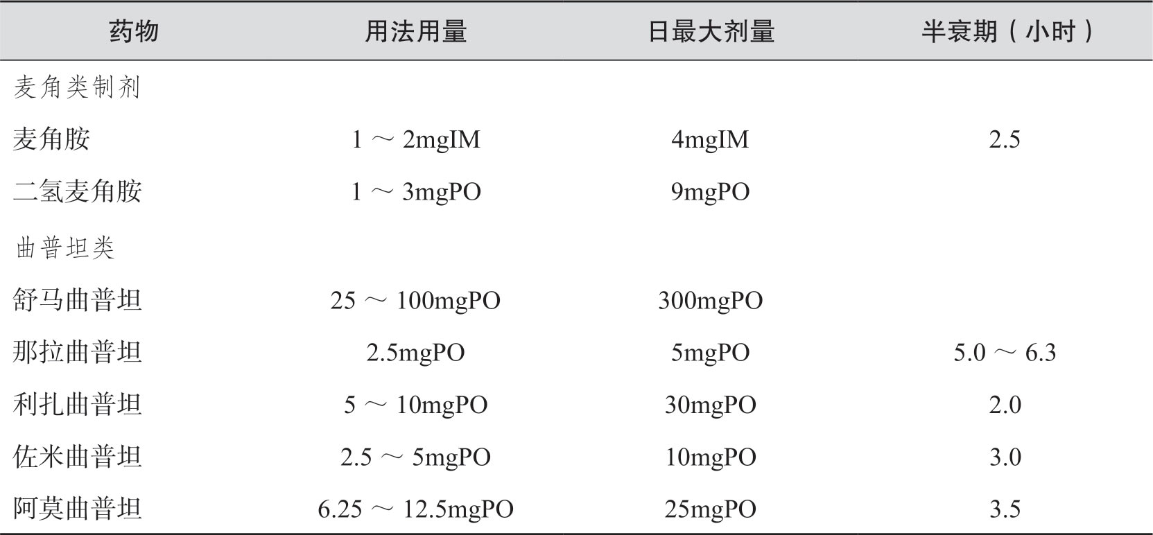 (2)中-重度头痛:严重发作可直接选用特异性治疗药物(表3-2),部分患者虽有严重头痛但以往发作对NSAIDs反应良好者,仍可选用NSAIDs。麦角胺类适用于发作持续时间长的患者。应注意麦角胺类和曲普坦类药物的不良反应,大量长期应用可引起高血压和肢体缺血坏死;严重高血压、心脏病和孕妇患者禁用。