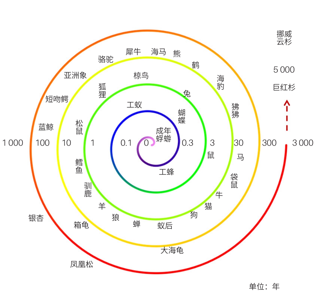 生命由每一秒、每一分、每一天构成。生命是一段旅程,从出生到死亡,不论其寿命是短还是长。蜉蝣成虫只有1天的寿命,工蜂平均寿命是2个月,家鼠的寿命在2年左右,驯鹿最长可以活17年,蓝鲸则能达到70~90岁,大海龟可以活几百岁。长寿冠军无疑属于植物:松树在中国文化里是长寿的象征,许多杉树的寿命可达上千年,而挪威云杉可以活5000年以上(见图1-2)。