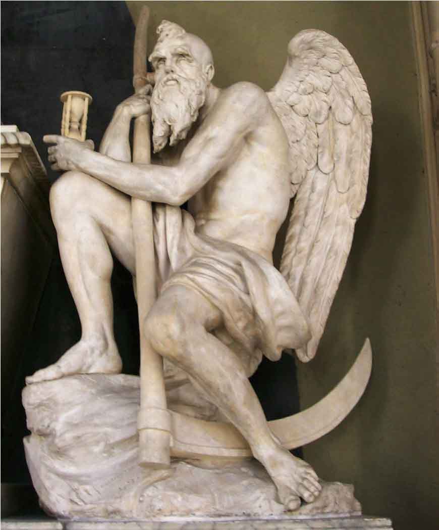 时间是如此虚无缥缈、难以描述。即便如此,古往今来,人们仍试图勾勒出时间的形象。在西方艺术里,时间是一位长着翅膀的老人,象征时间飞速流逝。他一手拿着沙漏,另一手拿着长柄镰刀,寓意时间会钩走一切(见图1-4)。