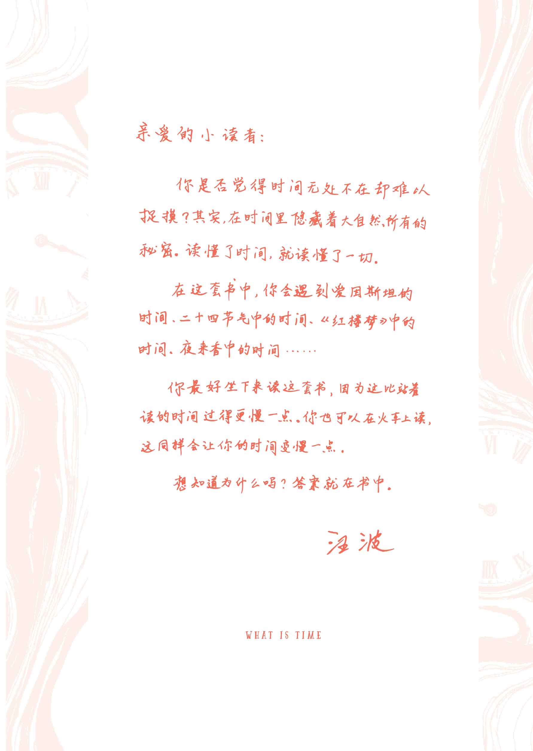 我们会探索时间的起源、时间的箭头和方向、宇宙在时间中的演化、节气和闰月、精密的时钟和人体里的生物钟。你会了解到我们农历新年的日期起源于何时,时间在高山上比在平原上流动得快那么一点点,时间的箭头有可能反过来,从未来流向过去,而身体里的生物钟也会跟随着地球自动调节时间。我会用一锅意大利字母面来比喻宇宙的起源,用帐篷里的影子来描述十二星座,用小溪里的漂流来说明时间如何变慢,用荡秋千来演示时钟的原理,用积木来解释闰月是怎么回事,用远去的汽车尾灯来形容宇宙如何加速膨胀。