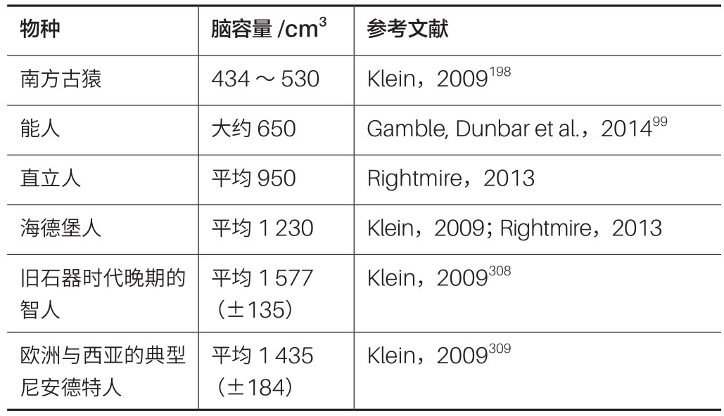 表1-2展现了古人类脑容量变化的大概趋势,但我们要非常谨慎地理解这种趋势。首先,体形很重要,体形变大,大脑也跟着变大。其次,在某些情况下,同一物种的脑容量在不同的时期和不同的区域有时会有很大的差异,尤其是直立人,晚期的直立人通常大脑更大(Klein,2009)