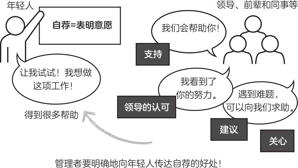为了不让优秀的年轻人才流失,管理者、前辈、导师、培训师等有必要向年轻人明确地传达自荐的好处(见图1-8)。