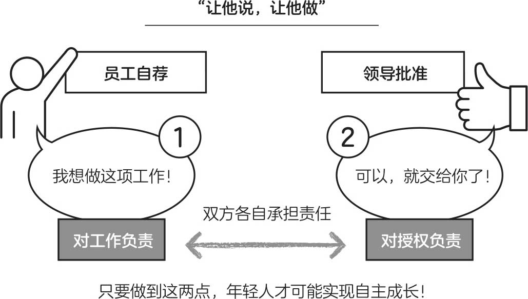 由此可见,“让他说,让他做”实际上是“员工自荐—领导批准”的过程,这是培养年轻人的基本原则。