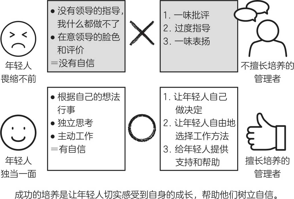 不擅长培养的管理者只会一味地指出年轻人的错误,削弱他们的自信心,或者强行给年轻人灌输自己的做法,不让他们自由发挥。如此一来,年轻人就会畏缩不前,也不会产生自信。
