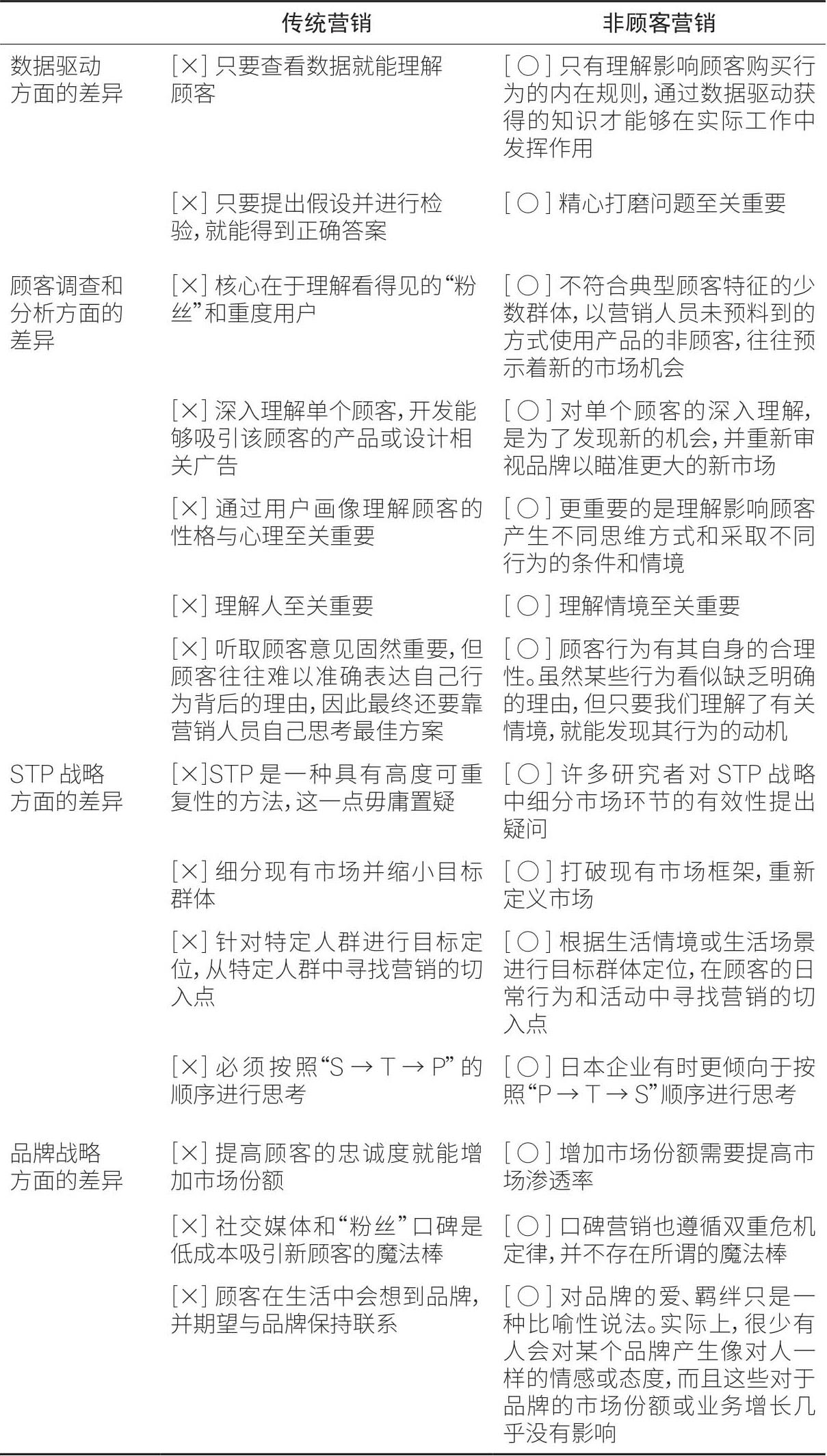 表3-1描述了传统营销与非顾客营销的差异。接下来,我将依次按照以下顺序进行解释:“数据驱动方面的差异”“顾客调查和分析方面的差异”“STP战略方面的差异”和“品牌战略方面的差异”。在此过程中,用“×”表示对传统营销的理解误区,用“⚪”表示非顾客营销所需的视角。