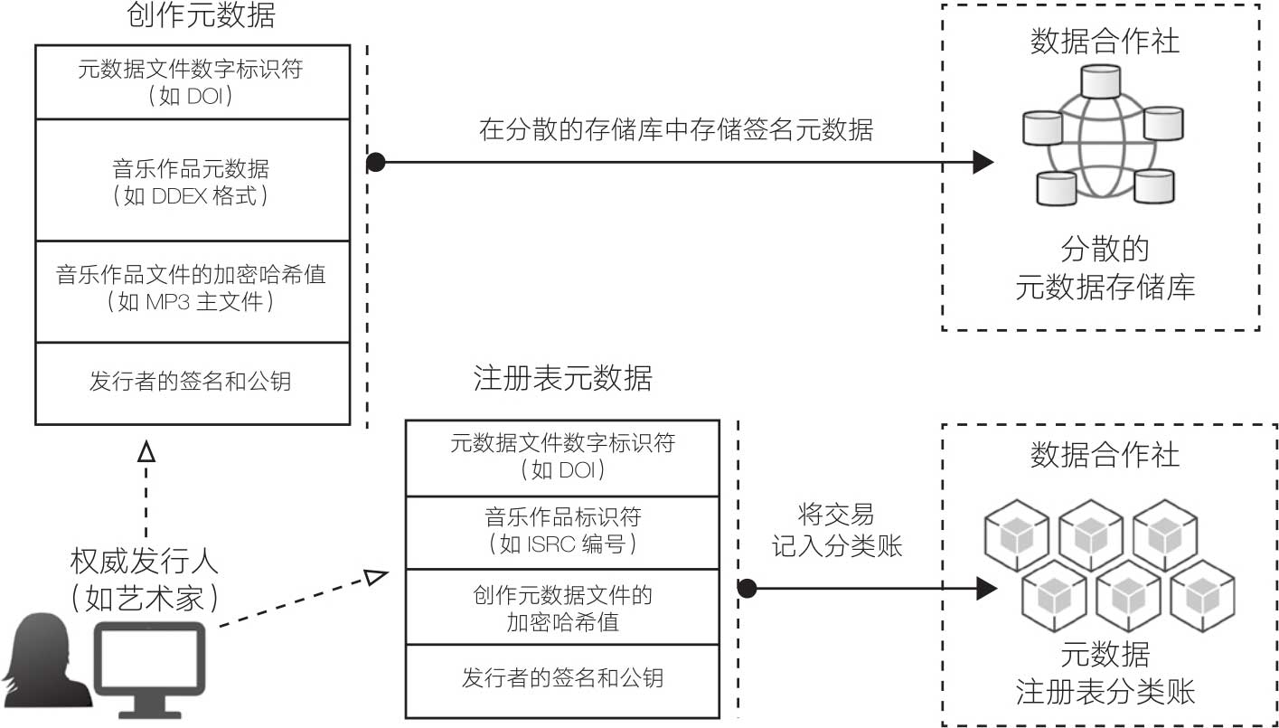 在帮助艺术家和音乐家管理其音乐作品方面,数据合作社展现了极大的吸引力。因为数据合作社不仅可以帮助艺术家和音乐家在共享IT基础设施的前提下创建权威的元数据,还可以让他们在掌握元数据文件和音乐作品(如MP3主文件和歌曲合成文件)控制权的前提下,实现对这些宝贵资源的低成本管理。数据合作社通过分布式账本进行元数据管理的流程如图3-3所示。