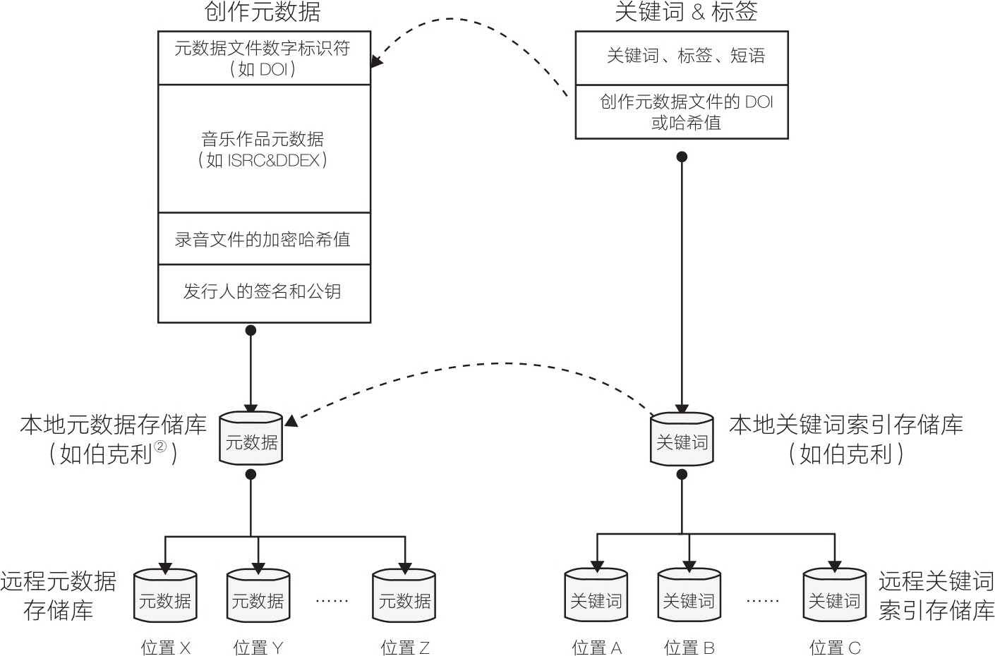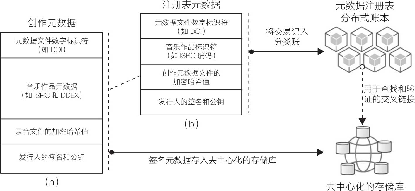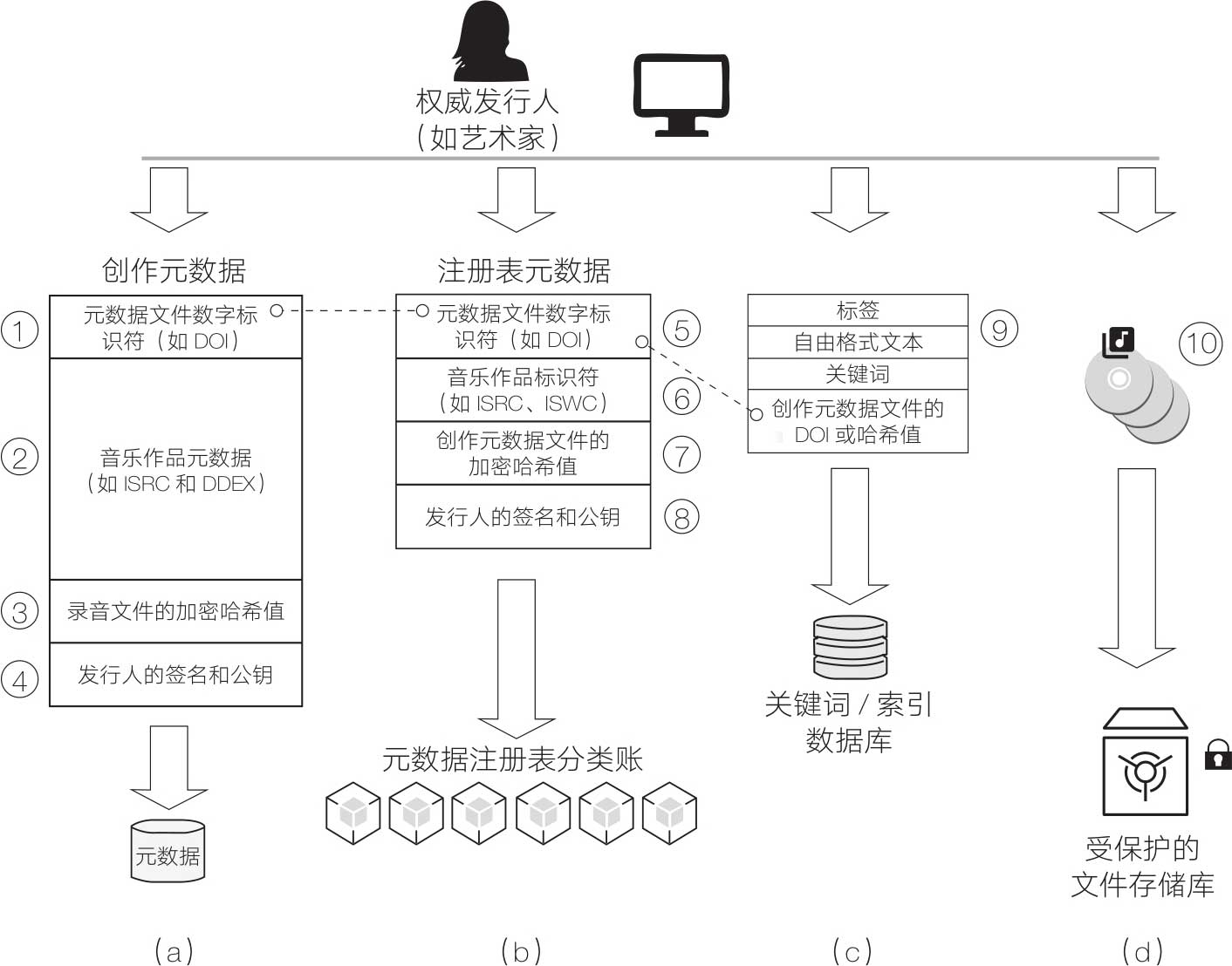 在本节中,我们使用了“音乐作品”来表示单独的歌曲、作品或曲目,并将歌曲作品和录制的歌曲视为两个独立的音乐作品,即使这首歌曲的作词者(或作曲家)和录音艺术家(或表演者)是同一个人。我们使用了“创作元数据”来指代给定音乐作品的事实信息,创作元数据不包含实际音乐作品本身(如录音MP3文件或WAV文件),也不得携带音乐作品的合法所有权或版权信息。这好比存储在美国国会图书馆和其他图书馆里的一本书的书目描述,并不包括这本书本身,也不包括关于该书版权的所有者信息。我们使用了“权利元数据”来表示与音乐作品法定所有权有关的信息。通常,权利元数据可能会被视作涉密信息,因此不宜对外公开。我们使用了“分布式账本”(或简单的分类账)来表示广义的区块链系统和网络概念。综上所述,本章将要描述的架构可以通过各种分类账,如以太坊(Ethereum) 26 、R3或Corda 27 和超级账本 28 来实现。