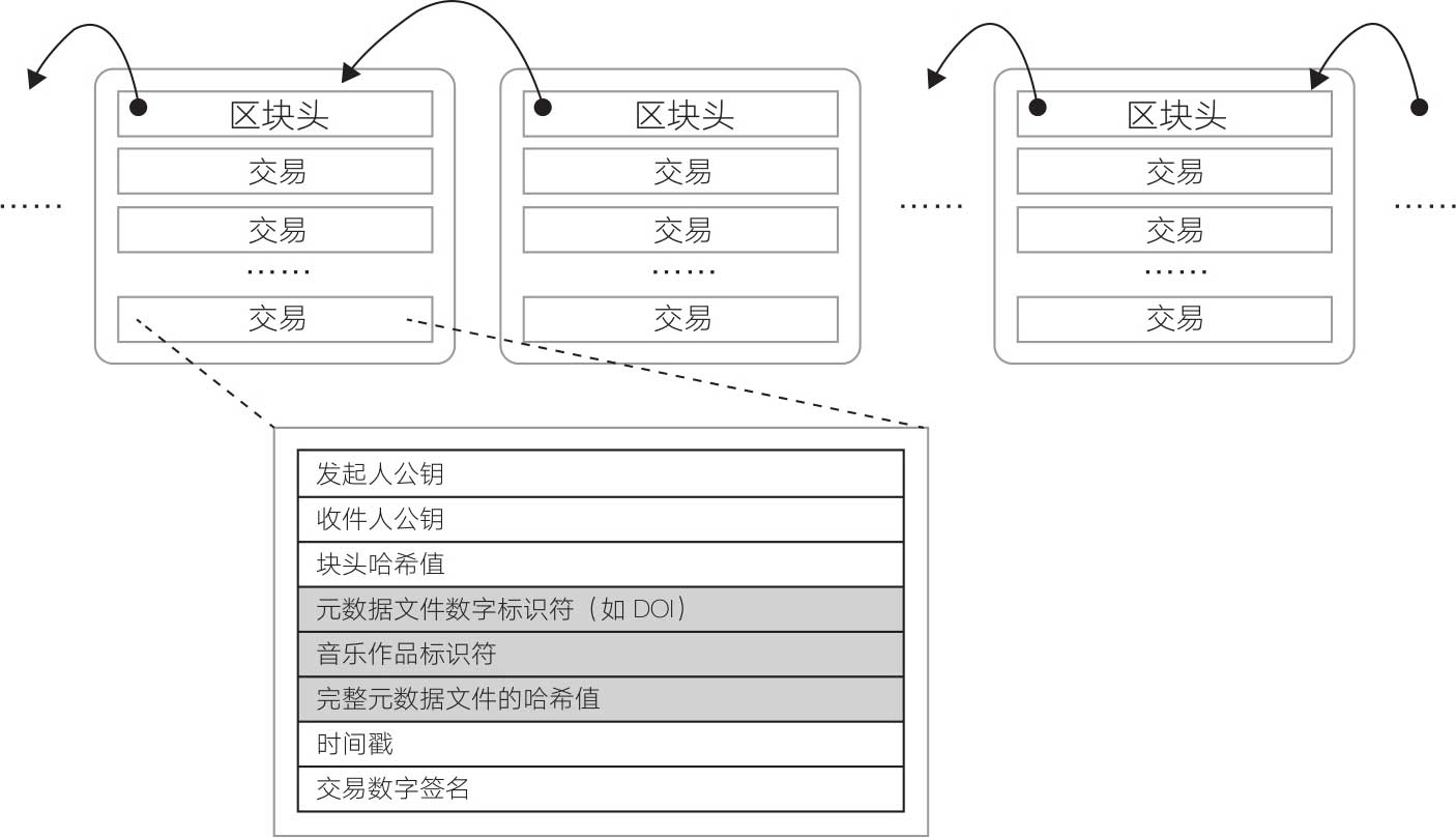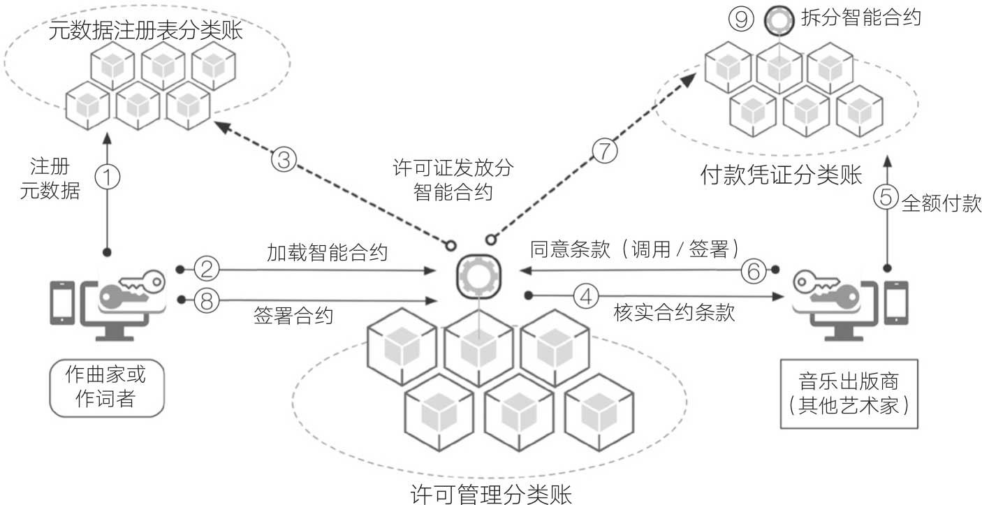 在过去几年里,作为一种潜在的新范式,分布式账本和区块链系统 19 已经赢得了艺术家和音乐家的广泛关注。基于这种新范式,当艺术家和音乐家的作品被消费者采用时,他们可以及时获取作品被采用情况的准确信息,并可以通过更直接的交易行为和付款方式,维持一种可持续的谋生方式 20 。