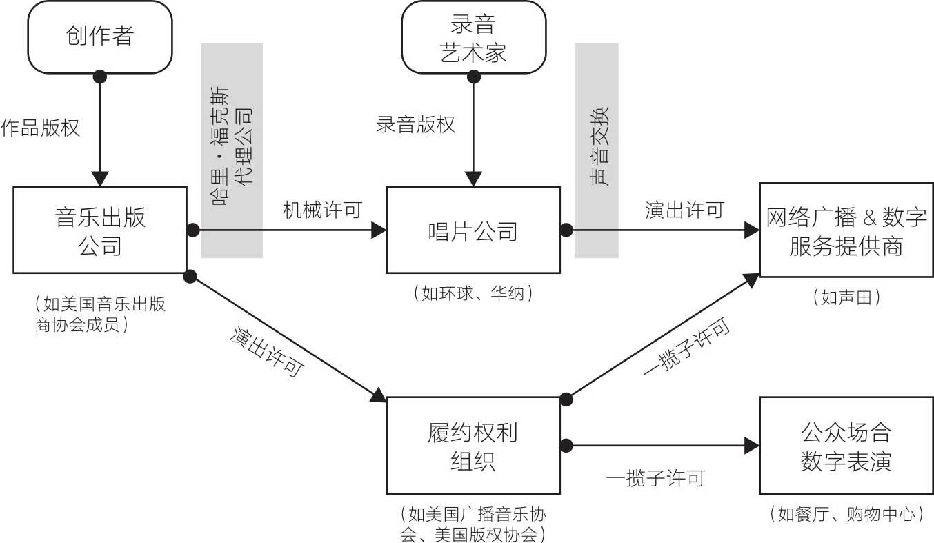 类似地,当声田、潘多拉等音乐流媒体服务商(它们通常被更正式地称为数字服务提供商)在向消费者提供流媒体服务时,它们必须首先从拥有合法录音版权的唱片公司那里获得相应的演出许可。为了收取和支付数字表演(如流媒体)产生的版税,美国国会在2003年成立了一个名为SoundExchange的非营利性集体版权管理组织。SoundExchange的主要作用之一就是为数字表演设定版税率。在音乐出版方面,成立于1927年的哈里·福克斯代理公司负责代表美国的音乐出版公司管理、收取和支付机械许可的费用。