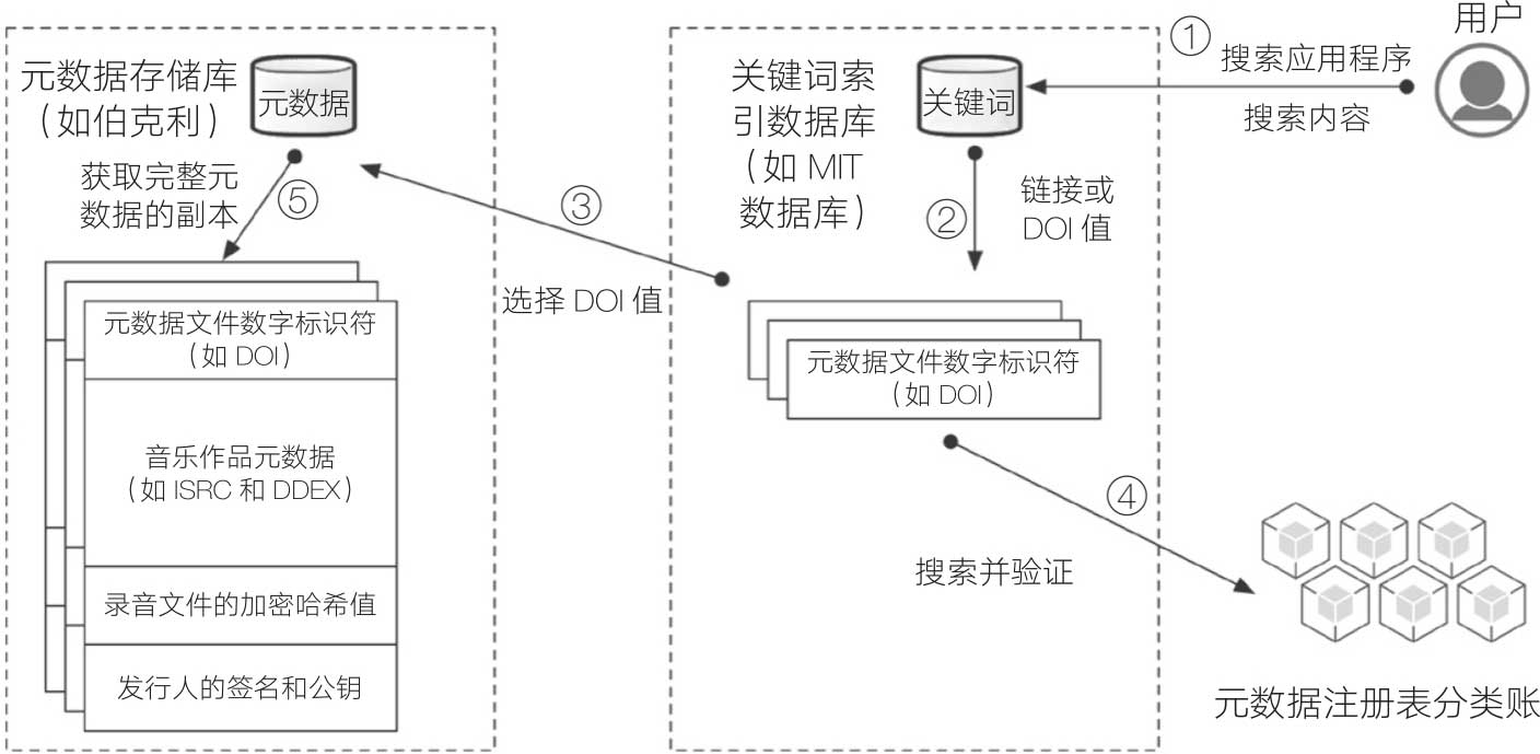 图3-9所示的搜索和查找元数据示例对该搜索过程进行了说明:第①步,用户通过搜索应用程序,在本地及全球的关键词索引数据库中进行搜索;第②步,搜索应用程序将搜索返回的一组链接或DOI值解析为完整的元数据;第③步,在搜索应用程序的结果中,用户通过选择某些特定的DOI值(如在客户端搜索应用程序中进行筛选),来获取完整的创作元数据文件;第④步,用户通过搜索应用程序,选择是否在元数据注册表分类账上验证更新版本的创作元数据文件;第⑤步,用户通过在创作元数据中找到的音乐作品的哈希值(如MP3主文件的哈希值),并使用受保护的API,从创作元数据文件的存储位置获取音乐作品(如MP3主文件)完整元数据的副本,这一步将要求用户通过身份验证,并获得音乐作品当前所有者的授权。