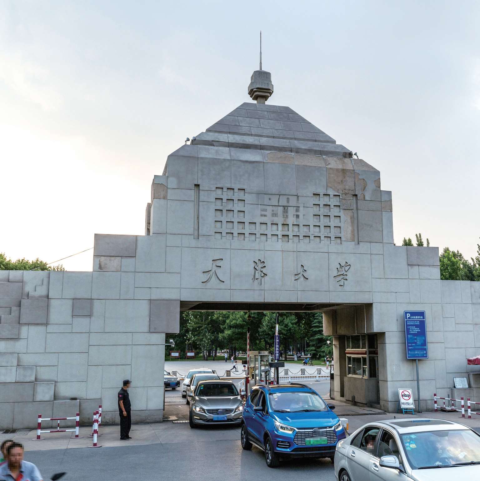 北洋纪念亭是天津大学的标志性建筑之一,建造于1995年,通体由花岗岩砌合而成,上方刻有浮雕和“北洋大学堂1895”几个大字,下方是由两根石柱顶起一个圆拱形成的拱形门。
