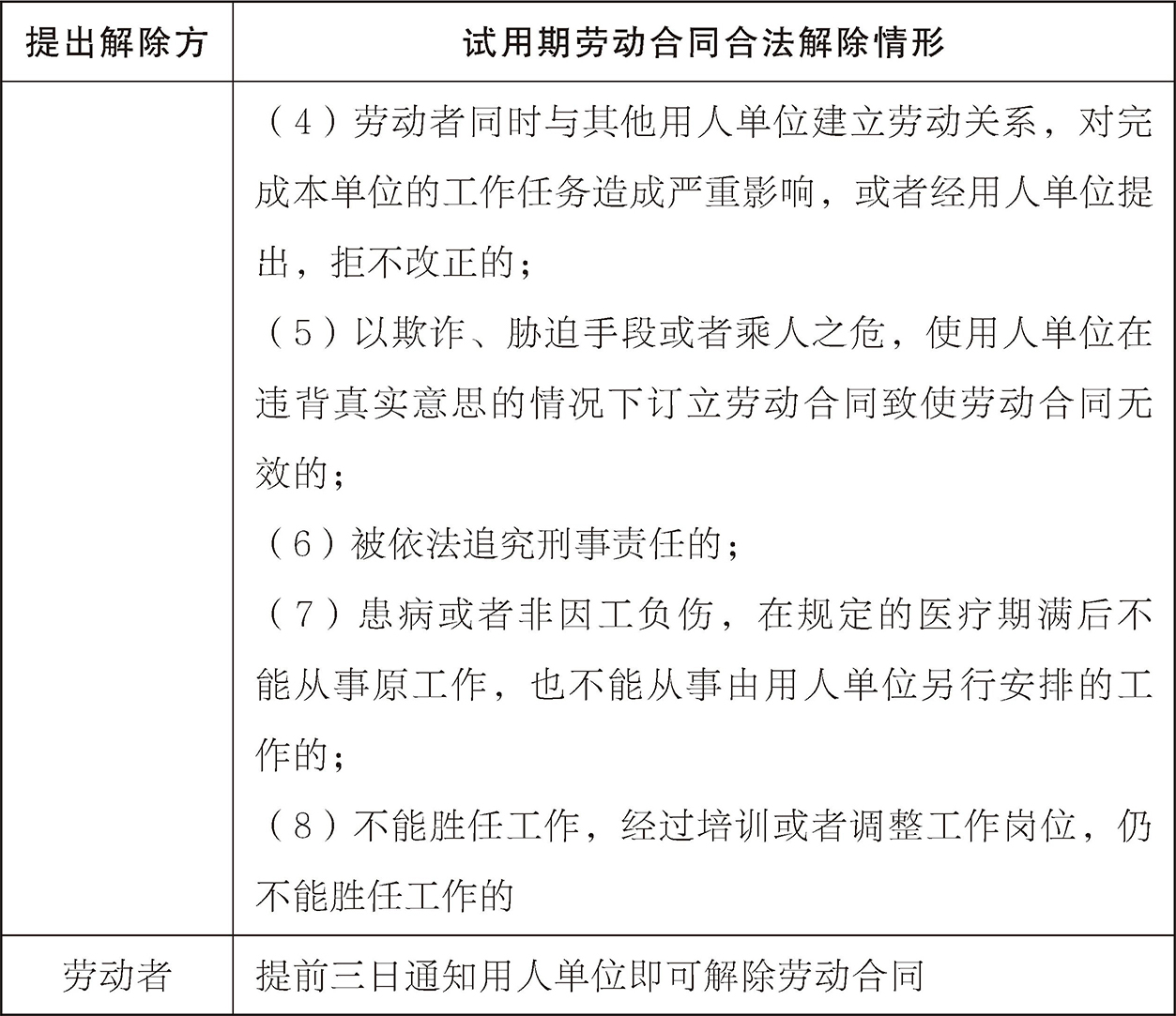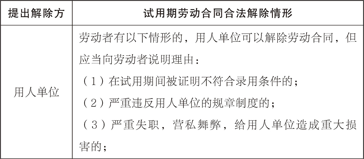根据《劳动合同法》第二十一条、第三十七条的规定,试用期内解除劳动合同的情形是法定的。由于解除劳动合同过程中劳动者通常是弱势的、权益更容易受损的一方,故法律对用人单位解除劳动合同的行为作了较为严格的要求。无论是否在试用期内,除非您存在用人单位可依法解除劳动合同的情形,否则用人单位均不得随意解除劳动合同;而如您在试用期内想要解除劳动合同,则只需要提前三日通知用人单位。具体内容详见表2-2。