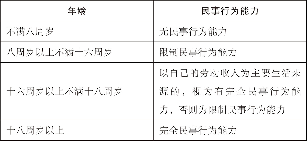 《民法典》第十七条至第二十二条规定,十八周岁以上的自然人以及十六周岁以上且以自己的劳动收入为主要生活来源的未成年人具有完全民事行为能力,可以独立实施民事法律行为。但是,前述两类人中不能完全辨认自己行为的属于限制民事行为能力人,只可独立实施纯获利益的民事法律行为或者与其智力、精神健康状况相适应的民事法律行为;不能辨认自己行为的属于无民事行为能力人,不可独立实施民事法律行为,具体关系详见表1-2。