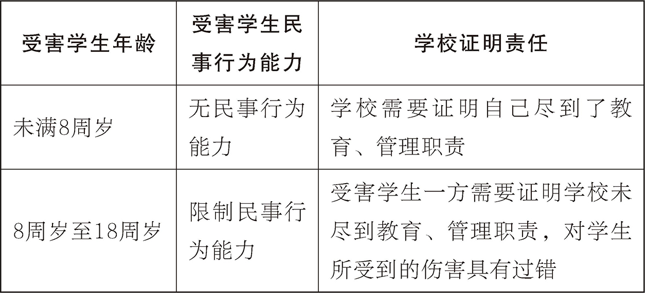 另一种情况是学生之间发生的伤害事件。这种情况学校是否承担责任,要看学校是否尽到了教育、管理职责。如果受害学生为无民事行为能力人,依据《民法典》第1199条规定,除非学校能够证明自己尽到了教育、管理职责,否则应当承担侵权责任。如果受害学生为限制民事行为能力人,依据《民法典》第1200条规定,在此类案件中,受害学生一方如果可以证明学校未尽到教育、管理职责,对学生所受到的伤害具有过错,学校就应当承担侵权责任。