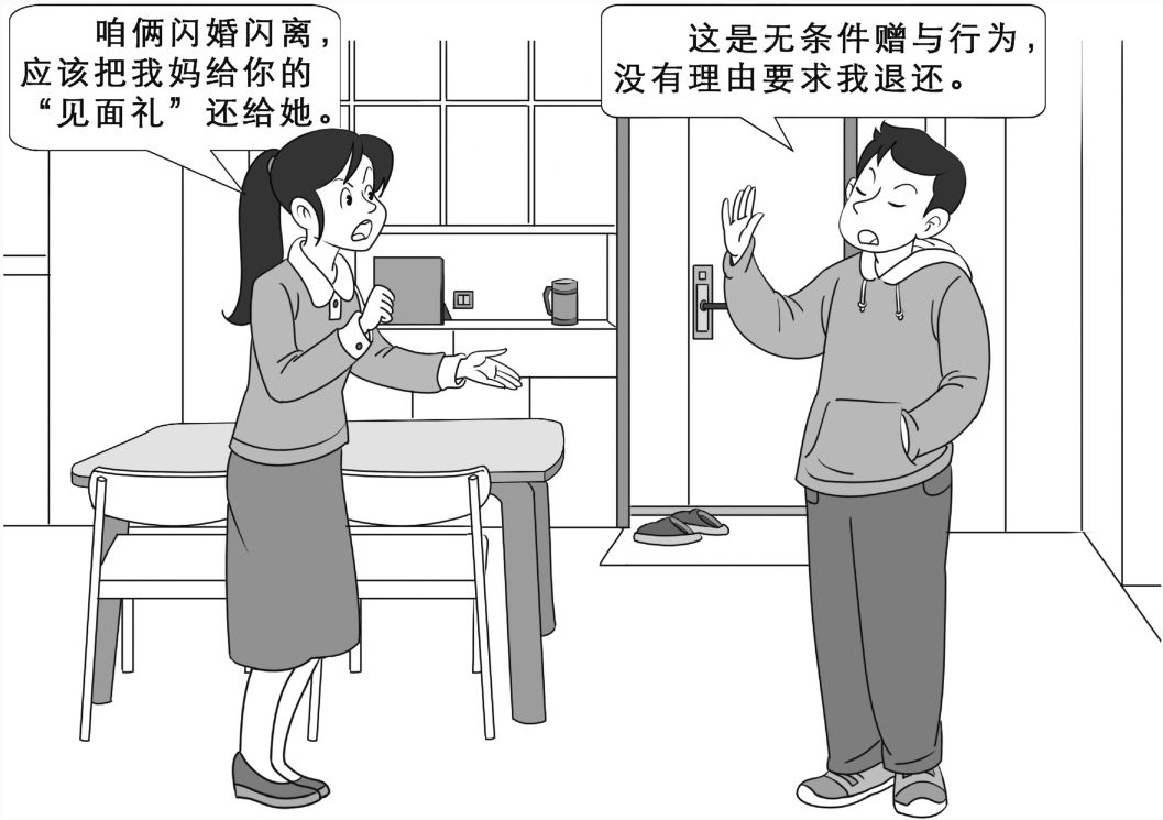 张先生与周女士2022年元旦举办订婚仪式,因周女士的父母早年间离异,周女士跟随爷爷奶奶一起生活,订婚当天周女士的父母并未到场见证。1月3日,二人共同前往周女士母亲处拜访,周女士母亲也甚是高兴,当即拿出一万八千元给张先生作为“见面礼”。2022年2月14日,张先生与周女士领取结婚证。6月,双方因举办婚礼等事宜多次发生争吵,张先生要求双方解除婚姻关系,并主张周女士返还所有彩礼。随后双方自愿达成离婚协议,并对彩礼返还问题进行明确。小夫妻的闪婚闪离,成了周女士母亲心里的“一根刺”,其认为给付“见面礼”系以两人结婚为目的,现双方离婚,一万八千元应予退还。请问,周女士母亲可以要回给女婿的“见面礼”吗?