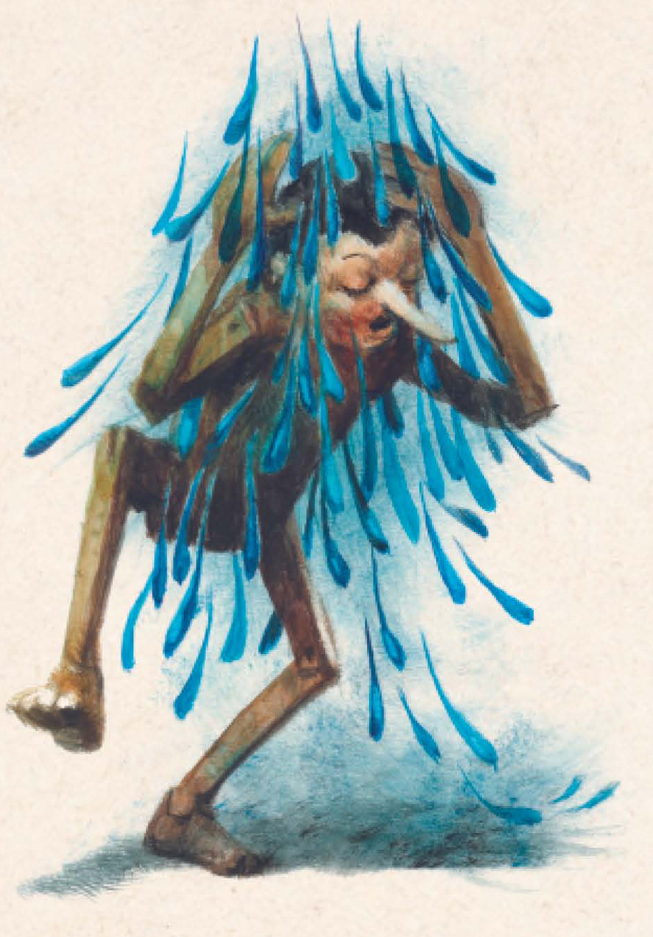 匹诺曹很快摘下他的小帽子。当他正要伸出帽子的时候,一大盆水向他身上直泼下来,从头浇到脚。