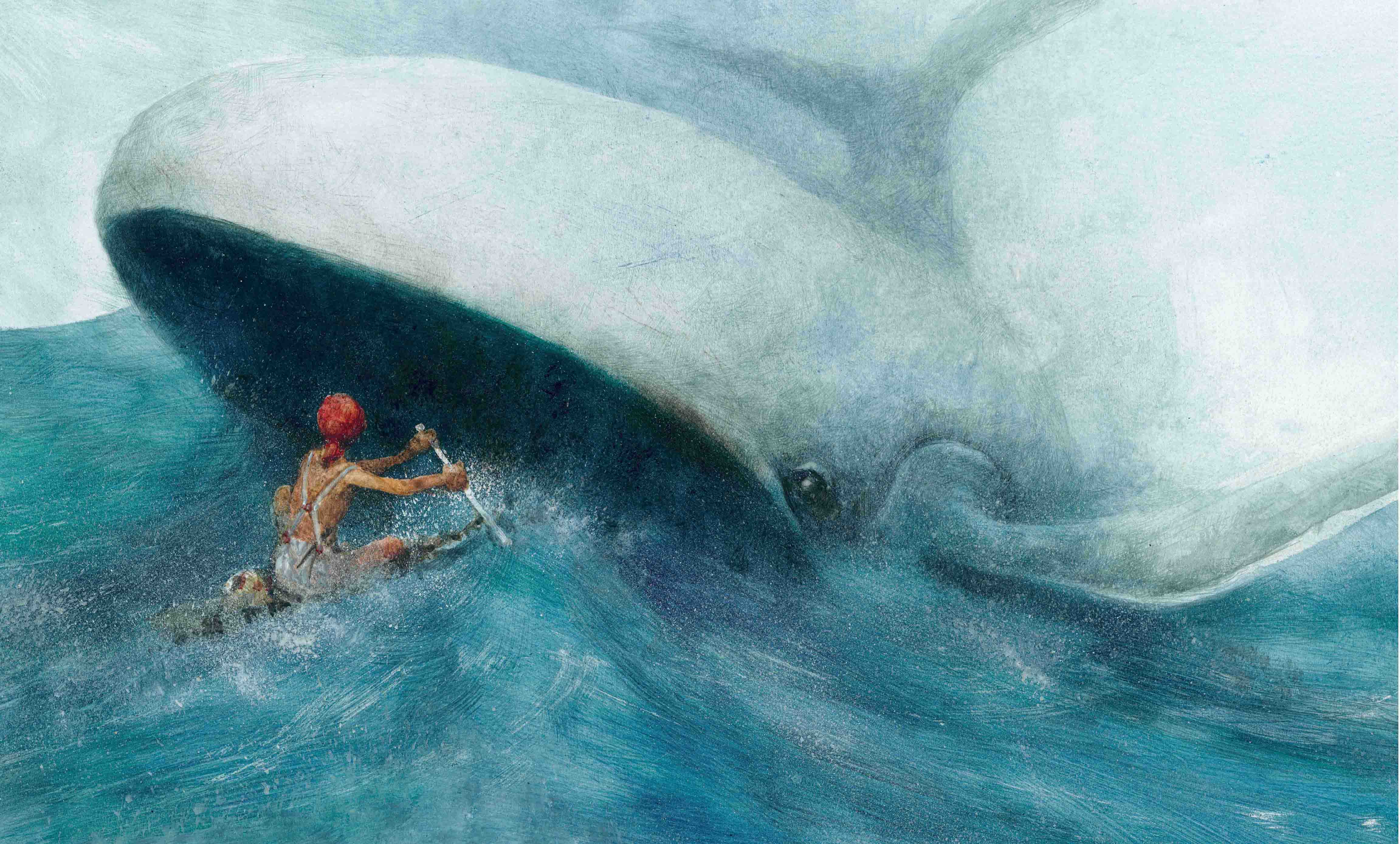 这里画的是那头鲸正在吞那个水手,你肯定还记得,就是救生筏上那个有折刀、有吊带,而且足智多谋的水手。
