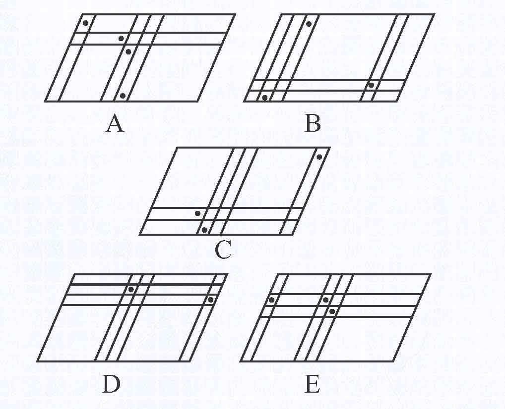 E。除E之外,所有图形的每一横行和每一竖列中都只有一个黑点。