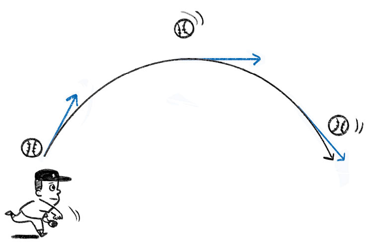 早杉: 投出去的球会先上升,但速度逐渐减慢,随后停止上升并开始下落,最终落地。这就是所谓的抛物线轨迹。如果用箭头画出方向,大概就是这个样子。