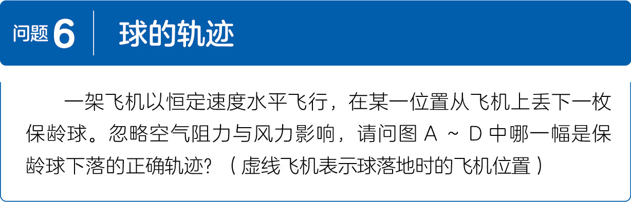 早杉: ……答案是A吗?原来是这样!这就像从我刚才画出的抛物线顶点出发的轨迹。球从飞机上掉落前已经随飞机移动,因此其初始速度不为零。