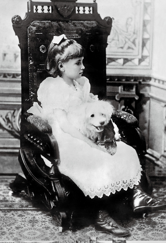 我对身边发生的事情一清二楚。五岁时,我学会了把从洗衣店里取回来的干净衣服叠放好,还能从中分辨出自己的衣服。当我通过母亲和姑妈的衣着打扮知道她们要出门时,必定央求她们带上我。如果家里来了客人,我总是被带出去打招呼,他们离开时,我会朝他们挥挥手——我依稀记得这手势的含义。有一天,几位先生来拜访我母亲,从前门的关闭声和其他的声响,我知道他们到了。我突发奇想,在别人还没来得及阻止我之前跑上楼,穿上一件我认为会客时该穿的裙子。我站在镜子前,学我曾见到的其他人的模样,往头发上涂发油,在脸上抹厚厚的粉,再用发卡将面纱别在头上,让它遮住我的脸,带着皱褶垂到肩部。然后,我找了一个巨大的裙撑系在我细小的腰间,结果它在我身后不停地摇摆,差点碰到我裙子的褶边。一番盛装打扮过后,我下楼去帮忙招呼客人。
