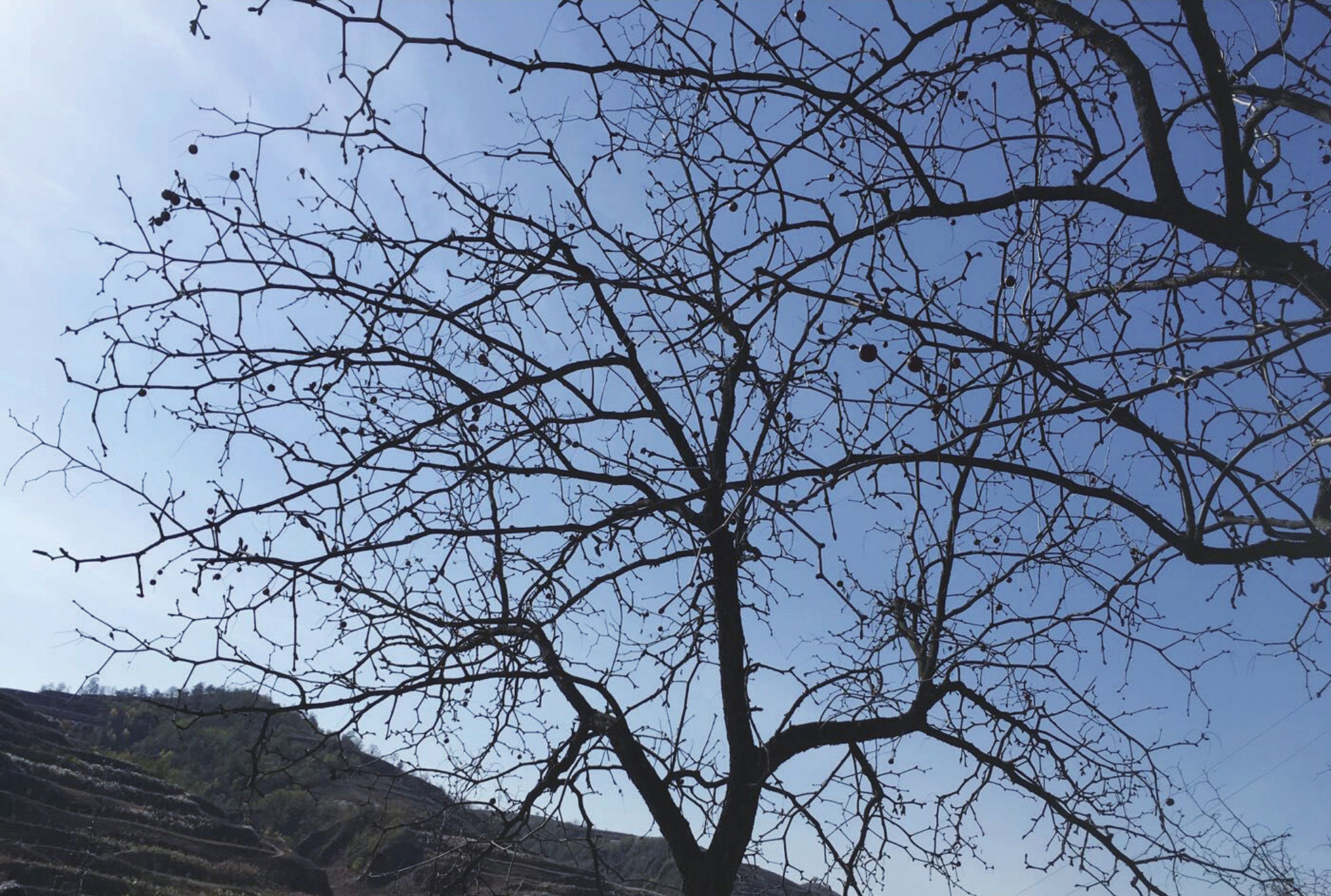 枣树虽已落尽了叶子,却还有几颗红枣挂在上面,