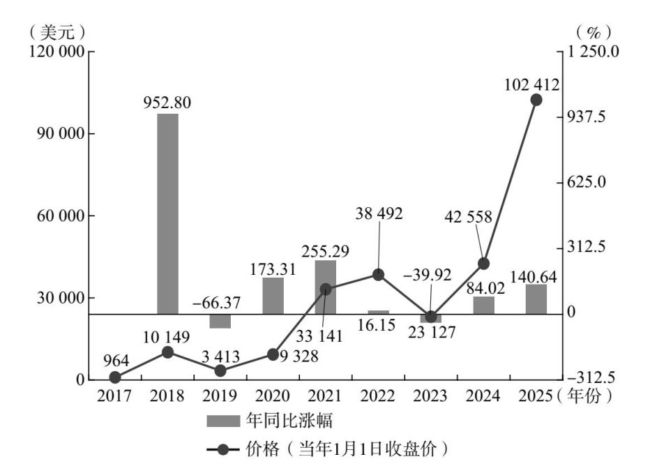 图1-1 2017—2025年比特币价格及年同比涨幅