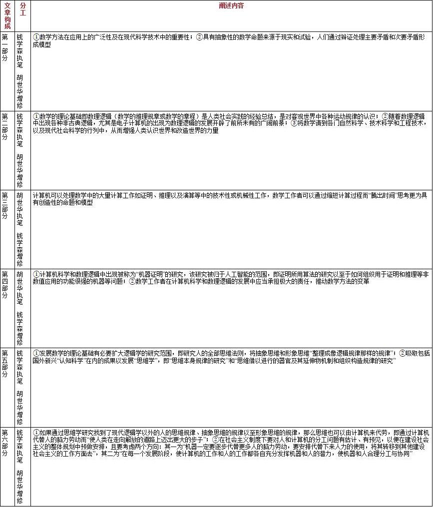 钱学森在手稿开篇就指明两个主题。其一,面对非科研工作者如新闻工作者、文艺人,“用辩证唯物主义来把数学这一门科学的来源和性质向大家解释清楚,使大家更了解数学家们的工作”,使其理解“现代自然科学、技术科学和工程技术,以及现代社会科学的发展都离不开数学”,即数学为何被称作“科学技术的皇后”。其二,“由于电子计算机的迅速发展,其功能越来越强,出现了所谓‘人工智能’,越来越大的一部分人的脑力劳动可以由机器来代劳了”,那么“在这种情况下,人该干什么”,“人和计算机该如何分工,如何协同”。围绕于此,文章分六个部分进行阐述,其概况如下表所示。