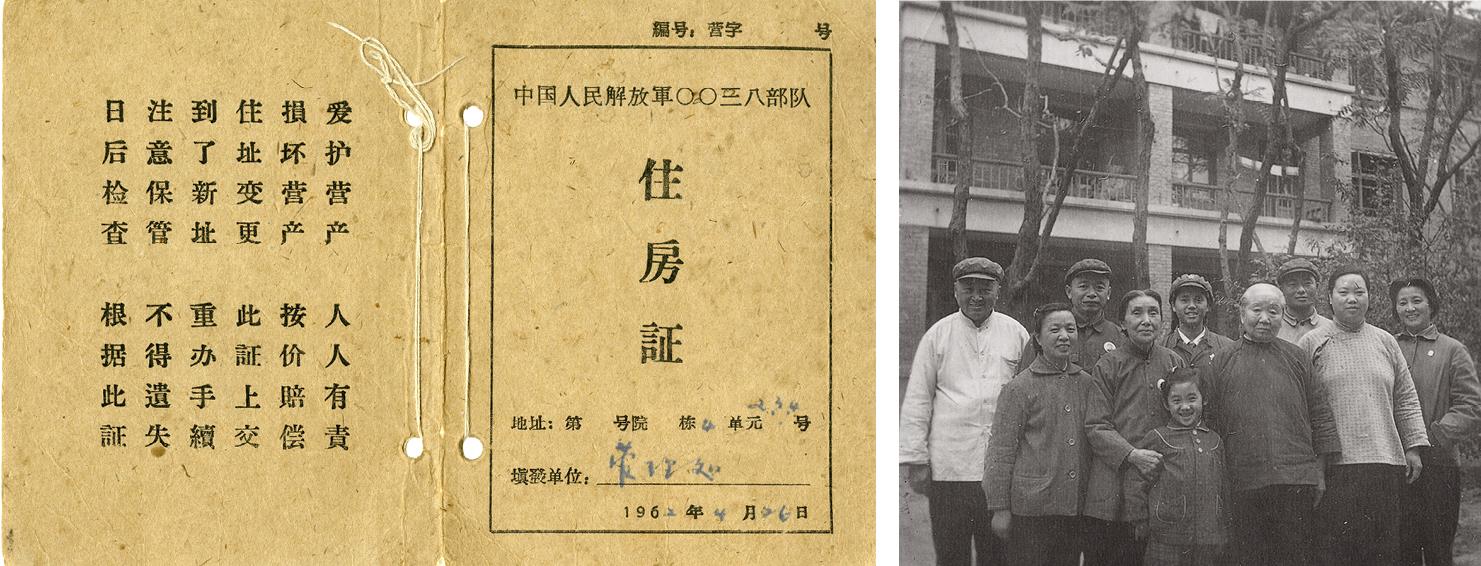 左图为1962年中国人民解放军〇〇三八部队管理处给钱学森居所办理的住房证。右图为蒋英等人在航天大院居所院前的合影,其时钱学森因出差在外而未能参加合影,右起为蒋英、幸盖秀(保姆)、邢宝平(管理员)、蒋英奶妈、钱永真、张琳(钱月华女儿)、蒋左梅(蒋英母亲)、黄英富(司机)、钱月华、汪德绍(厨师)