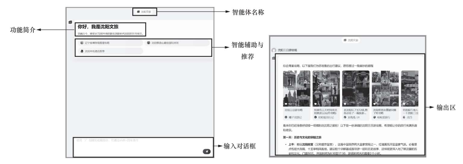 用户界面使用户能方便地与智能体进行交互,向智能体下达指令,并通过智能体获取信息等。图1-2所示为智能体“沈阳文旅”的用户界面。