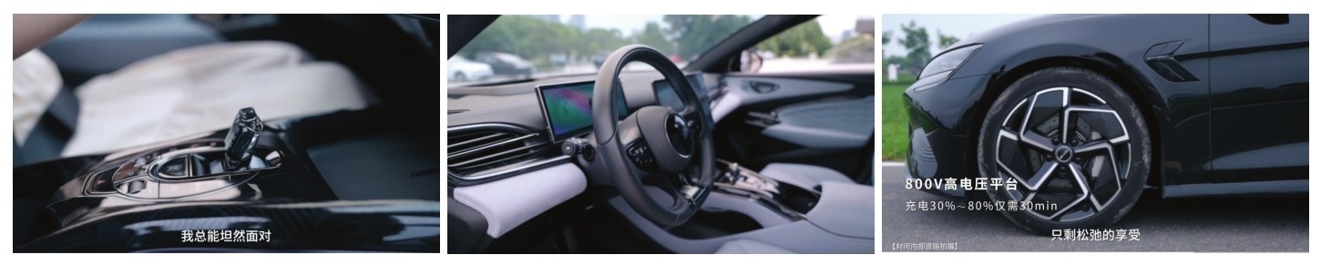 近景主要用于表现被摄对象的局部,在拍摄人物时,通常呈现人物胸部以上的神态细节,此时环境处于次要地位。由于近景拍摄的画面可视范围较小,人物和景物的尺寸足够大,能清楚地呈现被摄对象的细微之处,所以非常有利于表现人物的面部表情或者其他部位的状态、细微动作以及景物的局部状态,能使观众将注意力高度集中于被摄对象的主要特点,基本忽略环境与被摄对象的关系,让被摄对象在观众心中留下鲜明的、强烈的印象。以上这些都是远景、全景和中景画面难以表现的特性。图1-5所示的汽车宣传片中,使用近景镜头从多个角度充分展示了汽车的细节。