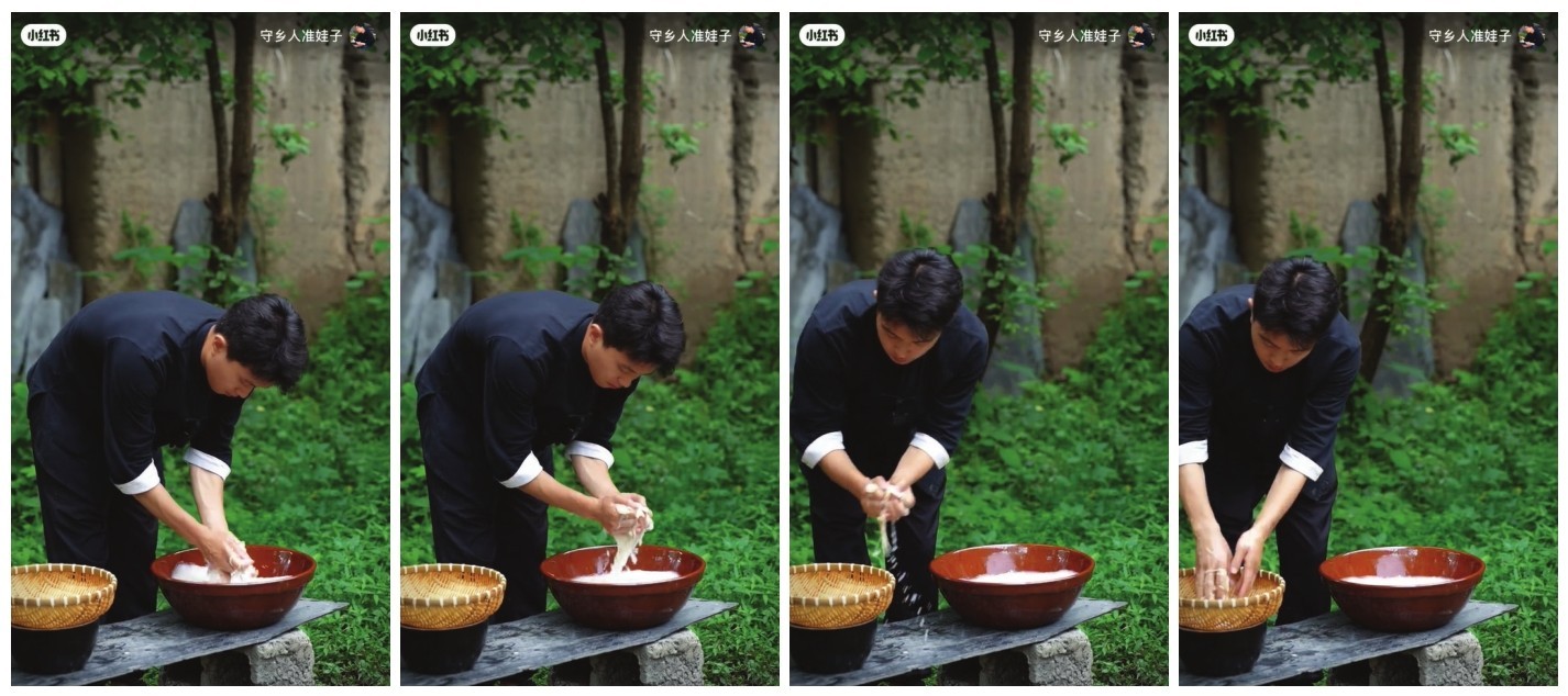 特写主要用于拍摄人物肩部以上的位置,或其他被摄对象的局部细节,通过放大局部细节来表现人或物的局部特征,揭示被摄对象的本质。特写的取景范围小,被摄对象充满画面,内容比较单一,但能够强烈地吸引观众的注意力。在短视频中使用特写镜头能够增强画面的表现力和感染力,向观众传达强烈的情感和清晰的信息,给人以深刻的印象。图1-6所示的美食制作短视频中,使用特写镜头近距离展示了美食的制作过程。
