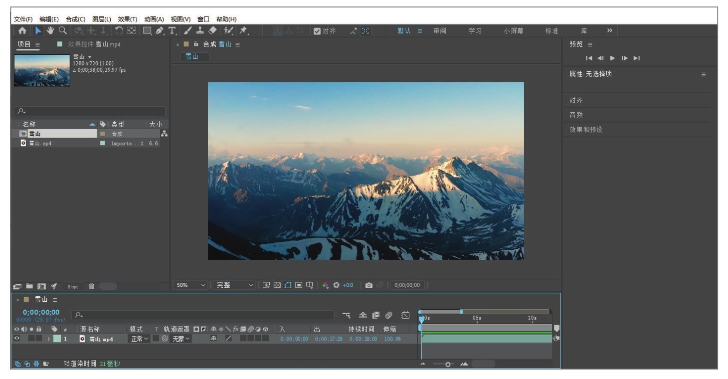 After Effects是由Adobe公司开发的另一款视频后期编辑与处理软件,其功能非常强大,在短视频制作中扮演着至关重要的角色。After Effects拥有强大的短视频处理能力、丰富的特效库和灵活的编辑功能,可以轻松实现视频、图像、图形、音频等素材的编辑合成以及特效处理,为短视频创作者提供了无限的创作可能。图1-18所示为After Effects的操作界面。