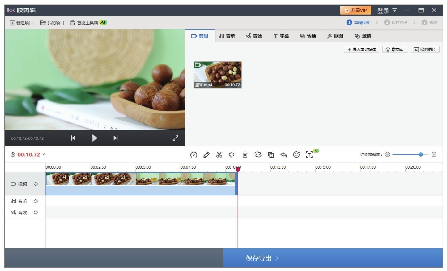 快剪辑是一款免费的视频编辑与制作软件,不仅支持剪辑短视频素材,为短视频添加音乐、音效、字幕、转场,以及进行抠图和调色等基础功能,还支持使用软件自带的AI工具去除素材上的水印、字幕等。快剪辑的操作界面简约大气、清晰易懂,用户无须具备专业的剪辑基础即可快速上手,大大降低了使用门槛。