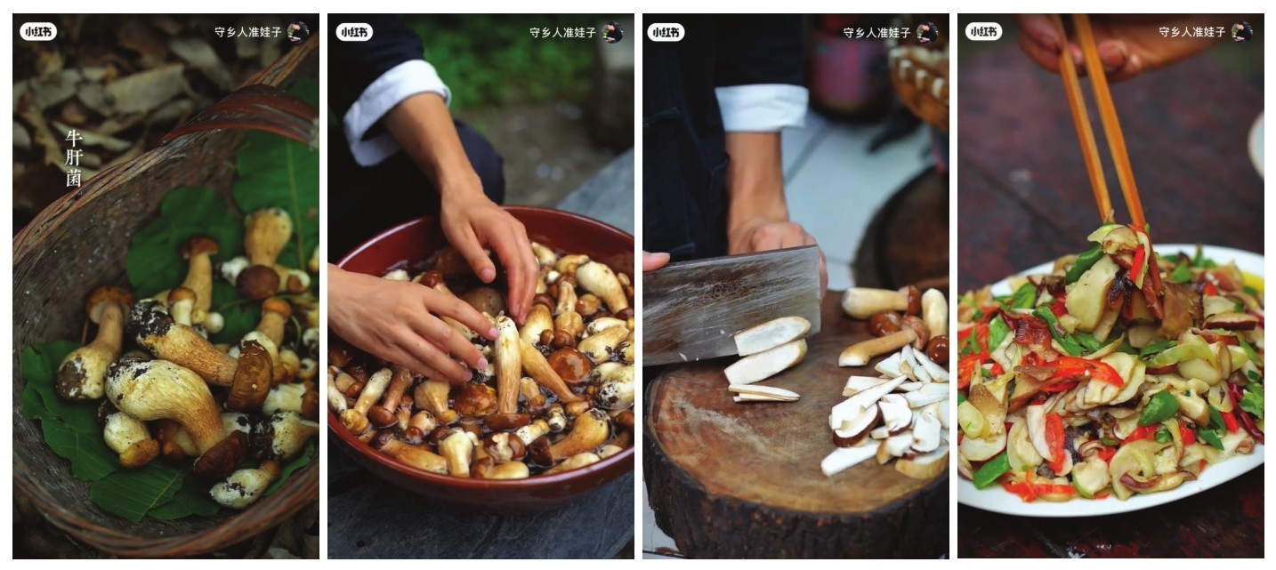 在自媒体领域,短视频由于其短小精悍、内容丰富、易于传播等特点,迅速成为最受欢迎的内容形式之一;其内容多样,涵盖了生活记录、娱乐、搞笑、教育、科普、美食、旅行、科技、美妆等多个领域,可以满足不同受众的需求。短视频不仅满足了现代人快节奏生活中碎片化的信息获取需求,还通过视觉和听觉的双重刺激有效提升了观众的观看体验。随着智能手机的普及和短视频编辑软件操作的简化,几乎任何人都可以成为自媒体短视频的创作者。图1-24所示为某记录农村生活的自媒体博主在小红书平台上发布的自媒体短视频,展示了牛肝菌从采摘到清洗、烹饪与品尝的整个过程,风格朴实自然,让观众感受到真实的乡村气息,吸引了众多粉丝的关注。