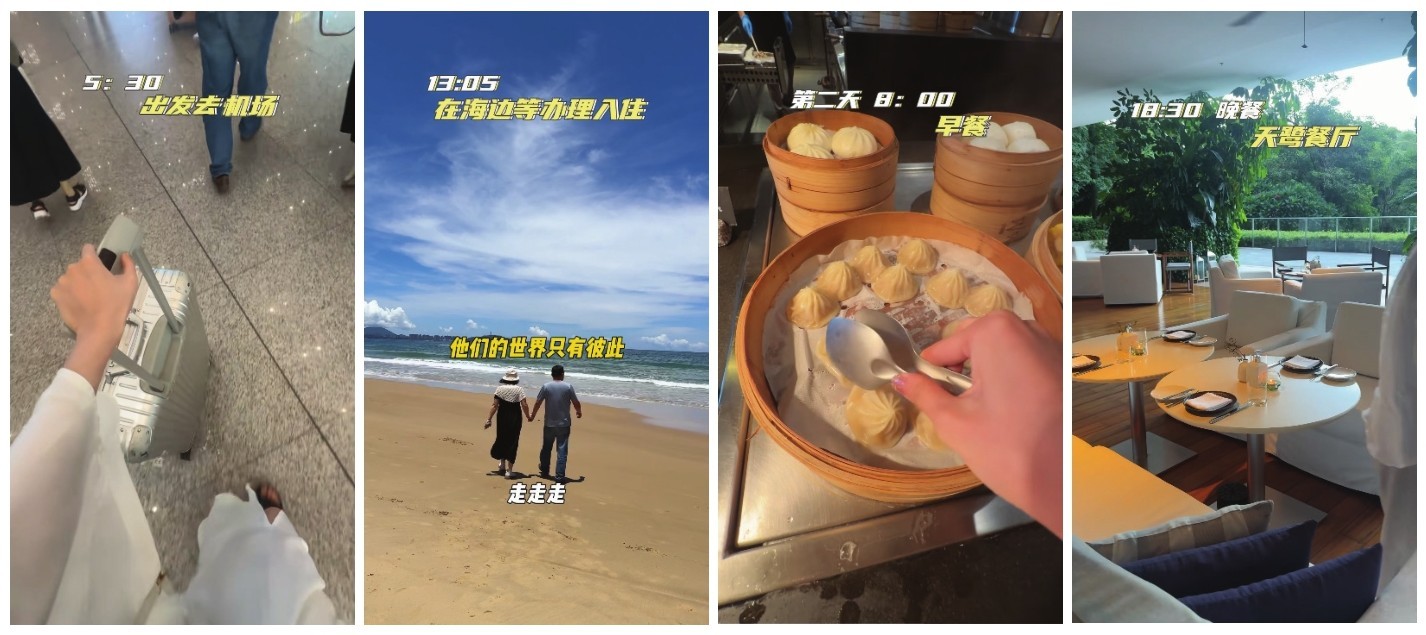 Vlog的全称为“Video Blog”或“Video log”,中文含义为“视频博客”或“视频日记”,是一种用视频来记录个人生活的短视频形式。通俗来讲,Vlog就是以视频为载体的网络日志。目前短视频平台上存在各种Vlog,内容涉及旅游、工作、学习、心情等不同的主题。另外,Vlog具有真实性和亲和力强的特点,能够迅速拉近博主与观众之间的距离;而且Vlog的内容一般不会很复杂,因此很多博主在初次尝试短视频制作时,都会选择制作Vlog。图1-25所示为某博主发布的以“沉浸式陪父母度假”为主题的旅游Vlog,展示了一家人的旅行全过程。
