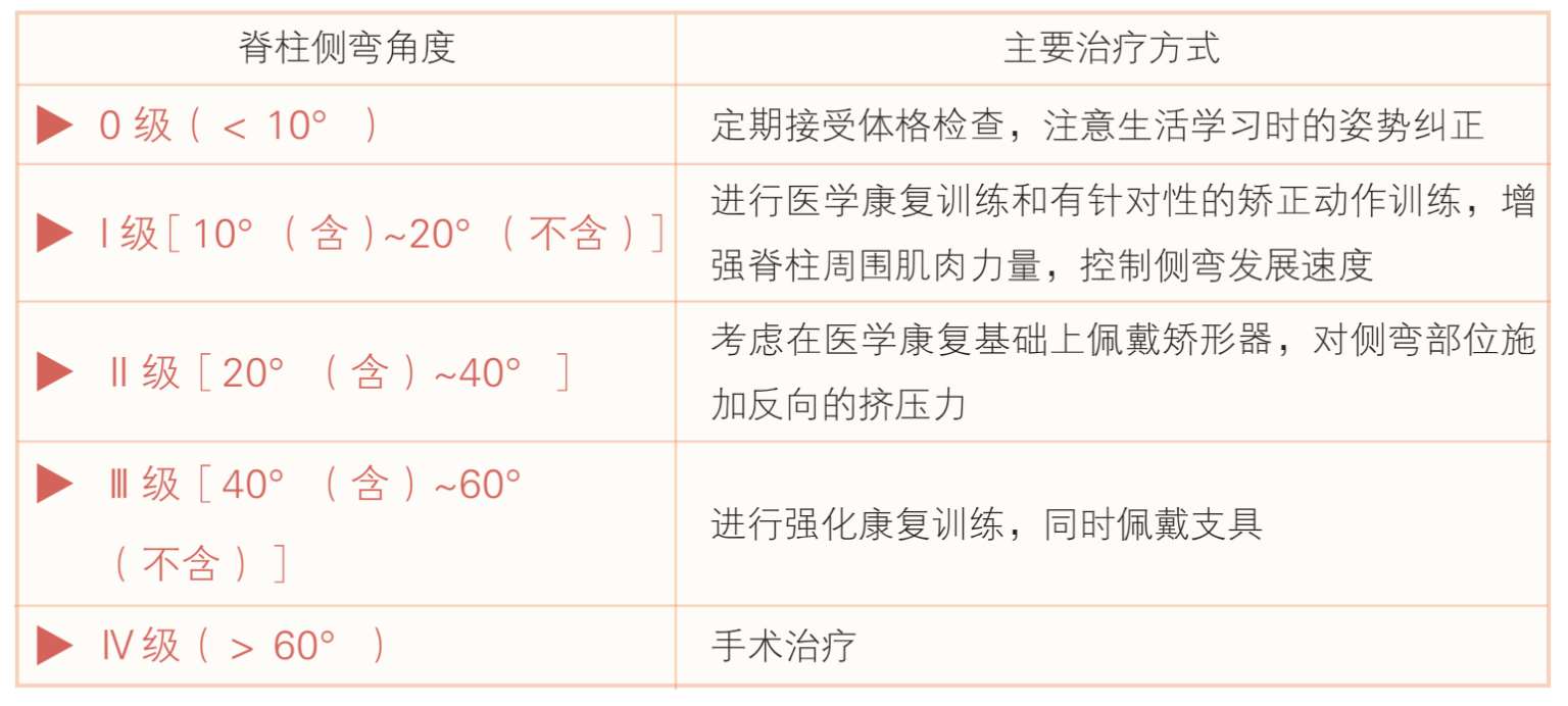 国际公认的对应脊柱侧弯症状分级的五种主要治疗方式如表1.1。