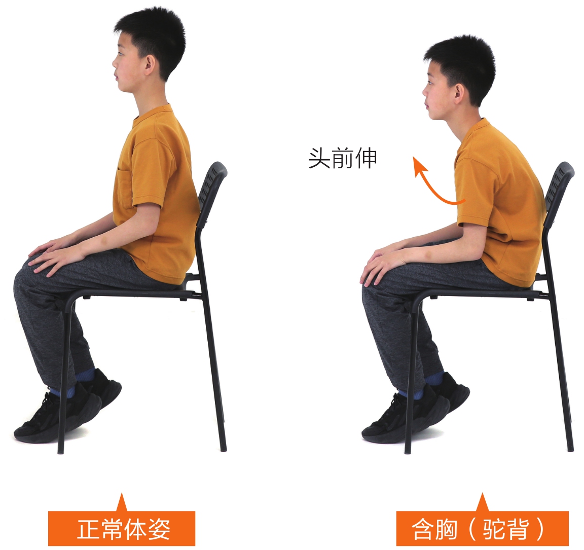 圆肩驼背几乎是当今手机不离手、游戏成瘾的低头一族的通病,其在外观上直观表现为头向前伸,两侧肩膀向内弯曲,后背驼起(见图1.3)。